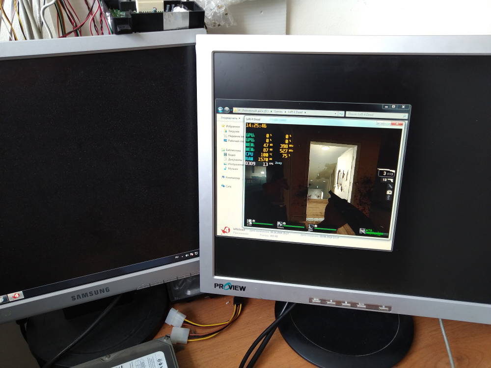После перезагрузки устанавливаете только один монитор на 6200. Никакого экрана загрузки не будет, поскольку по умолчанию всё идёт на PCI-E. Но туда монитор вставлять нельзя. Ждём появления экрана, видим систему, всё ОК. И вот теперь начинается забава «не дышите на него», поскольку от каждого неверного чиха система виснет. Браузер вешает всё, перетаскивание окон – тоже. Запустить игру возможно, но сделать ничего нельзя. Даже скриншот сделать невозможно, потому что Afterburner при попытке его сохранить вешает систему намертво. Мне удалось даже сделать одну фотографию запущенного Left4Dead, после чего система опять повисла.