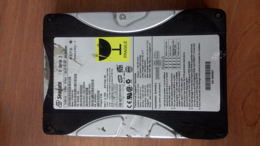 Нашёл старый, но живой Seagate на целых 20 Гб. Минимальные требования по установке Win10 - 16 Гб, так что нам хватит. Этот винт был самым старым из всех, что я нашёл. Попробуем установить систему на него и будем засекать время установки.
