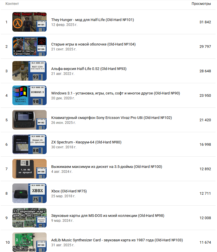| № | Название | Тема | Просмотры | Комментарии | Оценка "нравится" | Место в ТОП-10 по просмотрам за 2025 год |